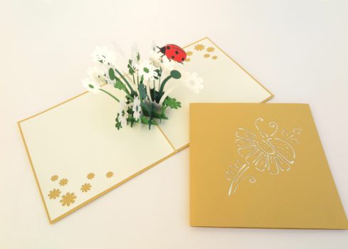 La Tarjeta Margaritas es un tarjeta Pop-Up hecha a mano. Con la llegada de la primavera esta mariquita se pasea entre las margaritas.