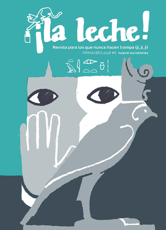 En el octavo número de ¡La leche! encontrarás: … auténticos símbolos de poder, un poema que habla de un poema, cierto hombre que le debe mucho a sus viajes en metro, cosas que hay que preparar antes de nacer, ciencia que te hace parecer más fuerte que el forzudo del circo, souvenirscon más de 5000 años, un montón de cerámica rota con mucha historia, monumentos escondidos bajo tierra, tres postales desde la antigua ciudad de Tebas, consejos para los que sueñan con momias, viajes por otros mundos, algunas técnicas para evitar la putrefacción, un templo que se desplazó unos metros, un burrito momificado, cosas que no existía en el antiguo Egipto, el misterioso minino con joyas, un perdón muy polémico, extrañas narices con piernas, un inconfundible estilo con la guitarra, la niña más gruñona del cine, ojos bizcos…. y siete dioses sin piedad.