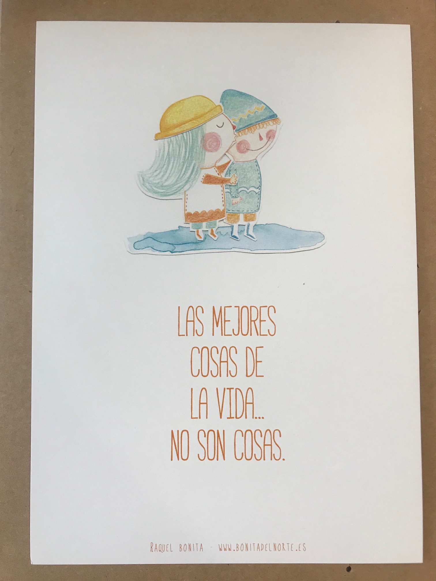 Tarjetón de regalo en cartulina con ilustración original de Raquel Bonita, y el texto «Las mejores cosas de la vida…no son cosas «. Incluye el sobre en cartulina marrón.