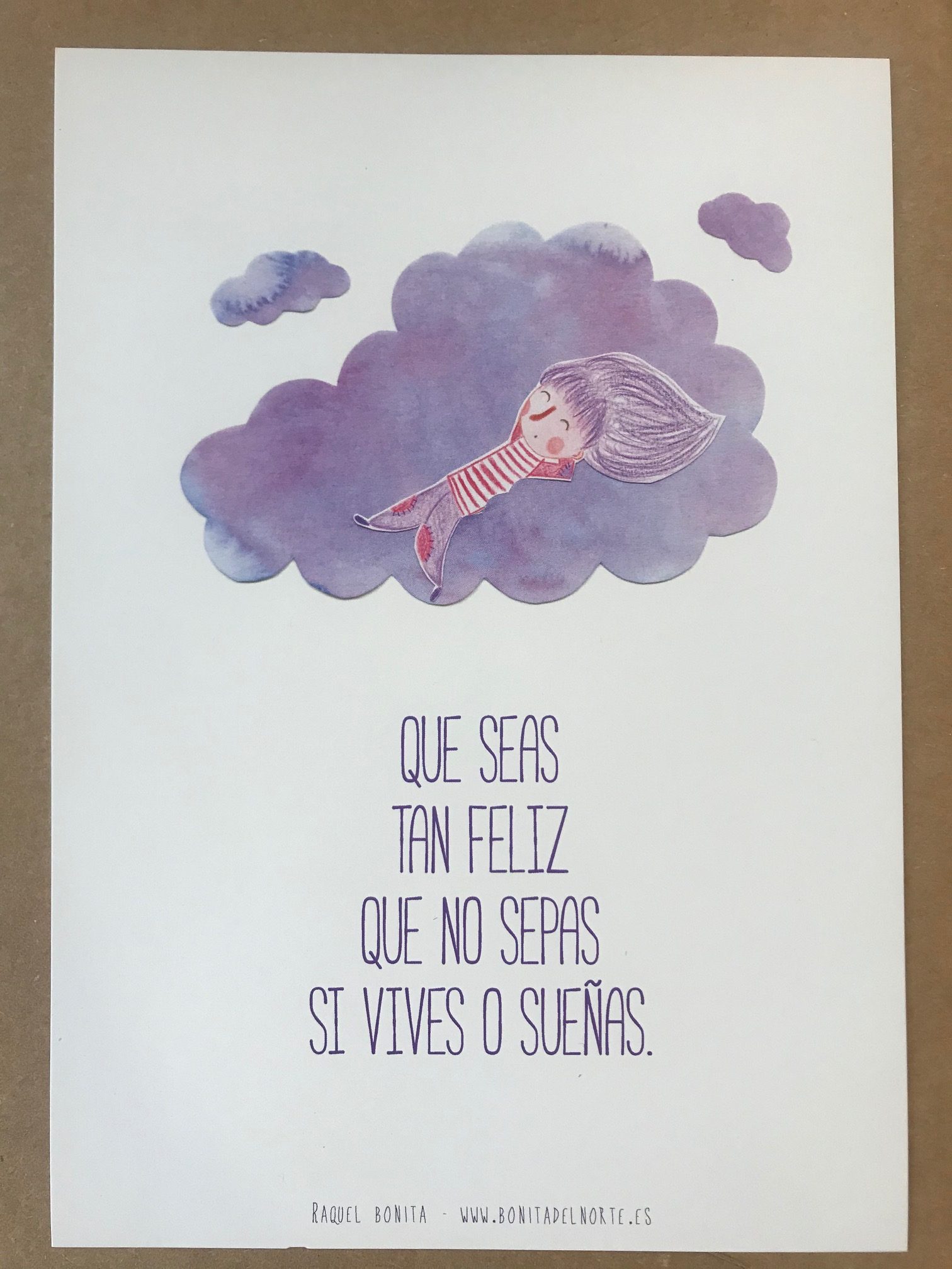 Tarjetón de regalo en cartulina con ilustración original de Raquel Bonita, y el texto «Que seas tan feliz, que no sepas si vives o sueñas «. Incluye el sobre en cartulina marrón.